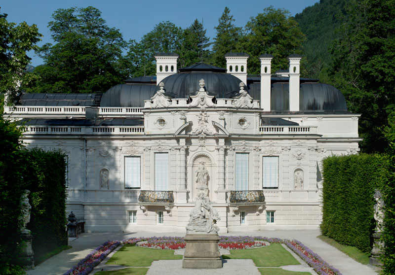 Ostfassade von Schloss Linderhof und östliches Parterre mit Figurengruppe Venus und Adonis. (© Bayerische Schlösserverwaltung, Konrad Rainer, Salzburg, bearbeitet) HLB