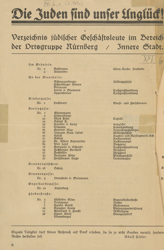 Auflistung jüdischer Geschäfte in Nürnberg, die wirtschaftlich verdrängt werden sollten. (Stadtarchiv Nürnberg, E39/I Nr. 1301/9) HLB