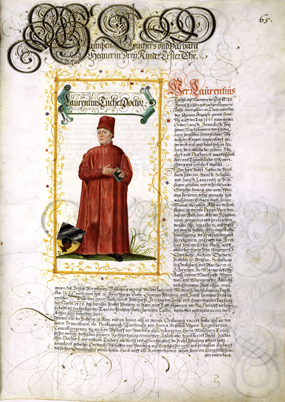 Der hier im Großen Tucherbuch dargestellte Lorenz Tucher (1447-1503) bekleidete 18 Jahre das Amt des Propstes an der Nürnberger Lorenzkirche und zählte zu den höchsten Geistlichen der Reichsstadt. (aus: Das Große Tucherbuch, entstanden zwischen 1590 und 1606, E 29/III Nr. 258, fol.65r)