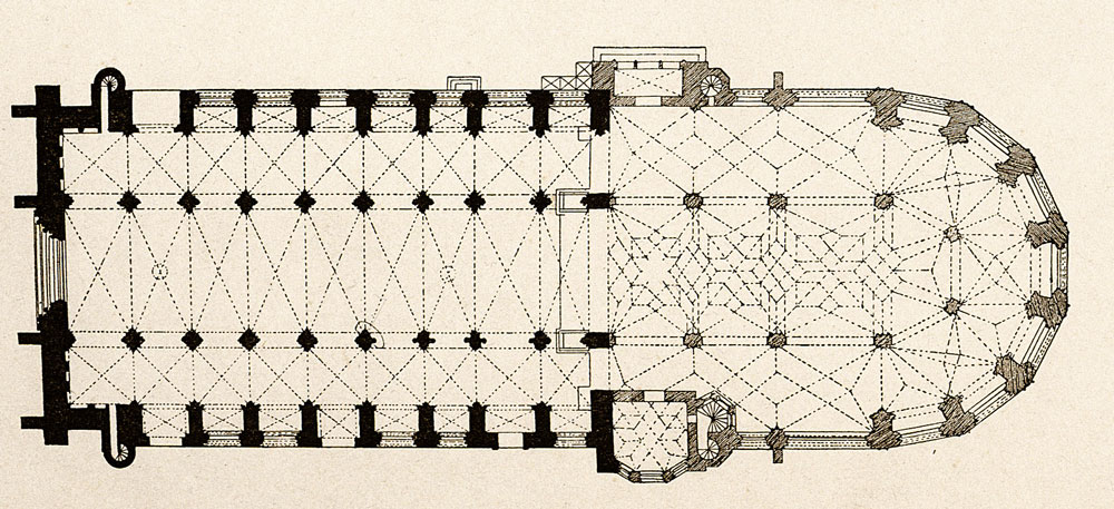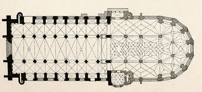 Grundriss von St. Lorenz in Nürnberg. Der Chor ist heller eingezeichnet. Abb. aus: Georg Dehio u. Gustav von Bezold [Hg.], Die kirchliche Baukunst des Abendlandes Bd. 3, Stuttgart 1901, Taf. 450. (UB Heidelberg lizensiert durch CC BY-SA 3.0 DE)