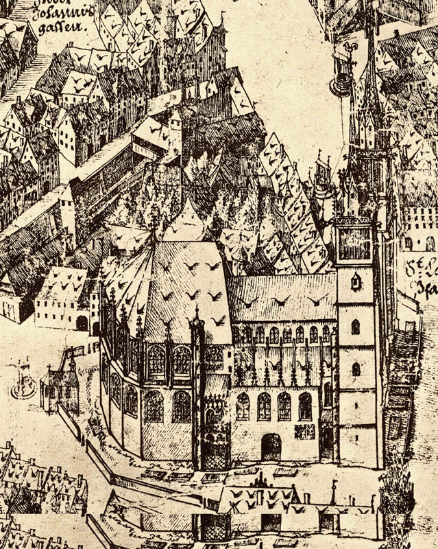 {{|1=St. Lorenz und Umfeld von Norden im „Prospekt der Reichsstadt Nürnberg“ von Hieronymus Braun, 1609. (Archiv der Lorenzer Kirchengemeinde)}}