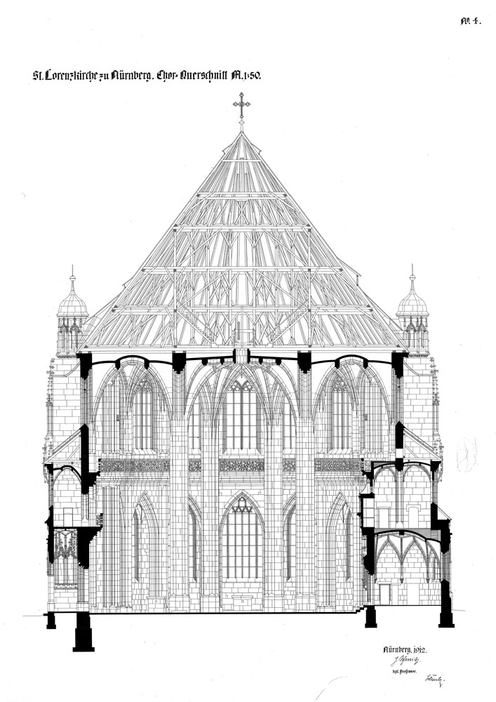 Querschnitt durch den Hallenchor in der Achse Brautportal/Sakristei aus der Bauhütte unter Josef Schmitz und Otto Schulz, 1912. (Quelle: Archiv der Kirchengemeinde St. Lorenz Nürnberg