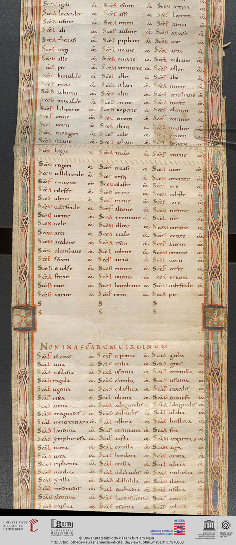 Sog. Lorscher Rotulus (Abschnitt mit der Nennung von Afra und Hilaria), Lorsch, wohl nach 843 bis 876. Frankfurt a.M., Universitätsbibliothek, Ms. Barth. 179, recto 3. (Frankfurt a.M., Universitätsbibliothek lizenziert durch CC BY-NC-ND 3.0 DE) HLB
