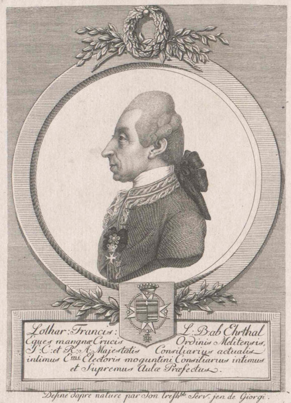 Lothar Franz Freiherr von Erthal (1717-1805) war Statthalter des Kurfürsten für das Fürstentum Aschaffenburg. Kupferstich nach einer Porträtzeichnung von Johann de Giorgi, vor 1795. (Österreichische Nationalbibliothek, PORT_00114620_01)