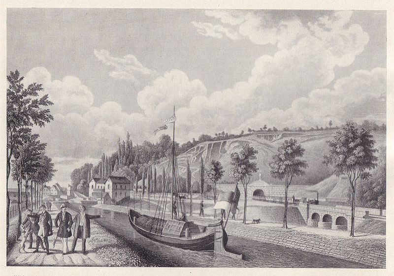 Ludwigskanal bei Erlangen. Im Hintergrund ist die König-Ludwig-Eisenbahn mit dem Burgbergtunnel zu erkennen. Stahlstich von Alexander Marx (1815-1851), 1845. Abb. aus: Das Bayerland 44 (1933), 196. (Bayerische Staatsbibliothek, 4 Bavar. 198 t-44)