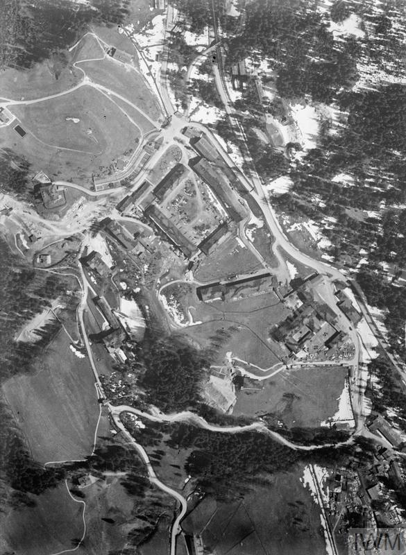 Luftbild vom Angriff der Royal Air Force auf den Obersalzberg; oben mittig der Berghof, rechts die SS-Kaserne, unten der Platterhof; auf den Fundamenten des kleinen Gebäudes im Zentrum, das zu diesem Zeitpunkt von der Partei-Kanzlei genutzt wurde, steht seit 1999 die Dokumentation Obersalzberg, 25.4.1945. (©Imperial War Museum, C 5252) HLB