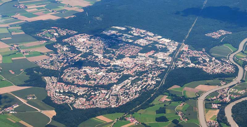 Die 1960 zur Stadt erhobene Vertriebenensiedlung Waldkraiburg entstand auf dem Gelände des ehemaligen Rüstungswerks Kraiburg. (Luftbild von Hansueli Krapf lizensiert durch CC BY-SA 3.0 via Wikimedia Commons)