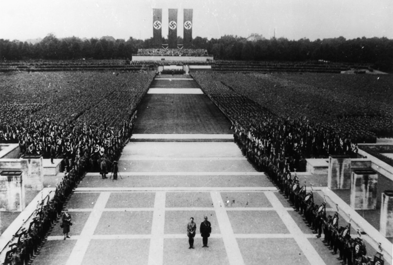 Hitler mit Ernst Röhm (1887-1934) in der Luitpoldarena auf dem Reichsparteitagsgelände in Nürnberg 1933. (Bayerische Staatsbibliothek, Bildarchiv hoff-8313) HLB