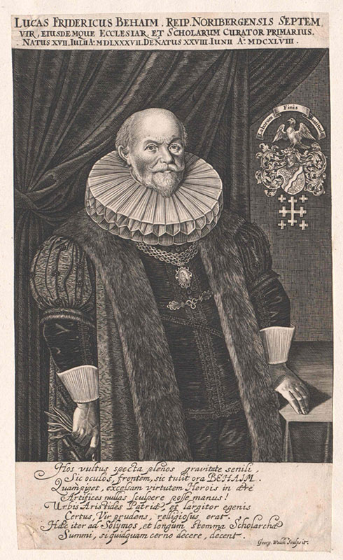 Lukas Friedrich Behaim (1587-1648), Kupferstich von Georg Walch (1610/12-1656). Der Patrizier reiste 1611 nach Jerusalem. Später wurde er Mitglied des Septemvirats, Stadtgerichtsassesor und Kirchenpfleger der Reichsstadt Nürnberg. (Österreichische Nationalbibliothek, PORT_00084147_01)