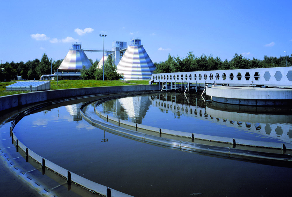 Nachklärbecken und Faulbehälter im Klärwerk München Gut Marienhof, 2005. (Foto: Münchner Stadtentwässerung)