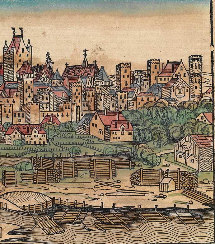 Älteste Darstellung der Münchner Neuveste (rechts im Bild), Abb. aus: Hartmann Schedel, Liber Chronicarum,Nürnberg 1493, fol. CCXXVI (Wikimedia Commons)