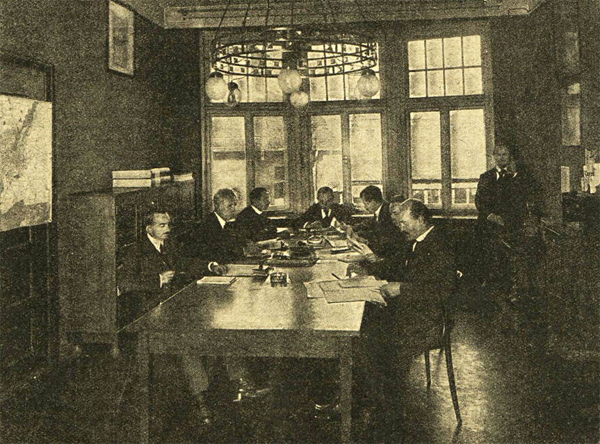 Journalistenzimmer der "Münchner Neuesten Nachrichten". Aufnahme vermutl. 1922. (aus: Fünfundsiebzig Jahre Münchner Neueste Nachrichten 1848-1922, München 1922, 8; Bayerische Staatsbibliothek 2 Eph. pol. 62)