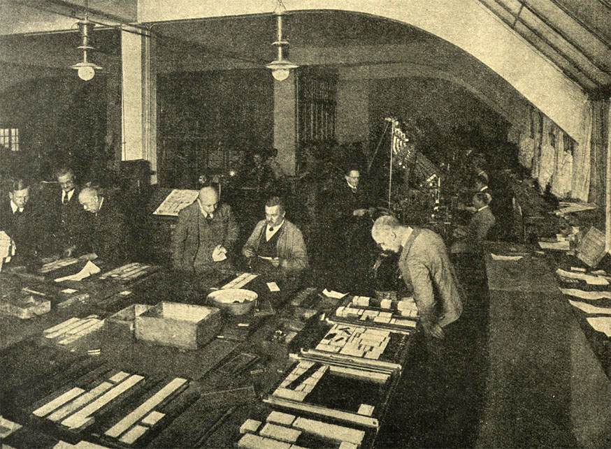 Redakteure und Metteure der "Münchner Neuesten Nachrichten" beim Umbruch der Zeitung. Durch die Metteure werden die fertig gesetzten Artikel und Überschriften zu einem Seitenlayout zusammengefügt. Aufnahme vermutl. 1922. (aus: Fünfundsiebzig Jahre Münchner Neueste Nachrichten 1848-1922, München 1922, 9; Bayerische Staatsbibliothek 2 Eph. pol. 62)