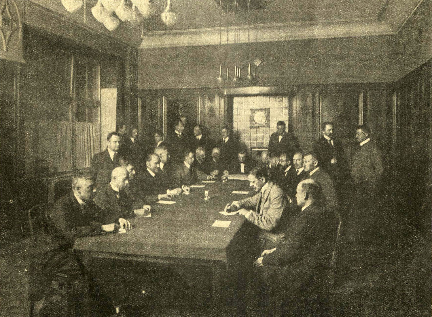Redaktionskonferenz der "Münchner Neuesten Nachrichten". Aufnahme vermutl. 1922. (aus: Fünfundsiebzig Jahre Münchner Neueste Nachrichten 1848-1922, München 1922, 7; Bayerische Staatsbibliothek 2 Eph. pol. 62)