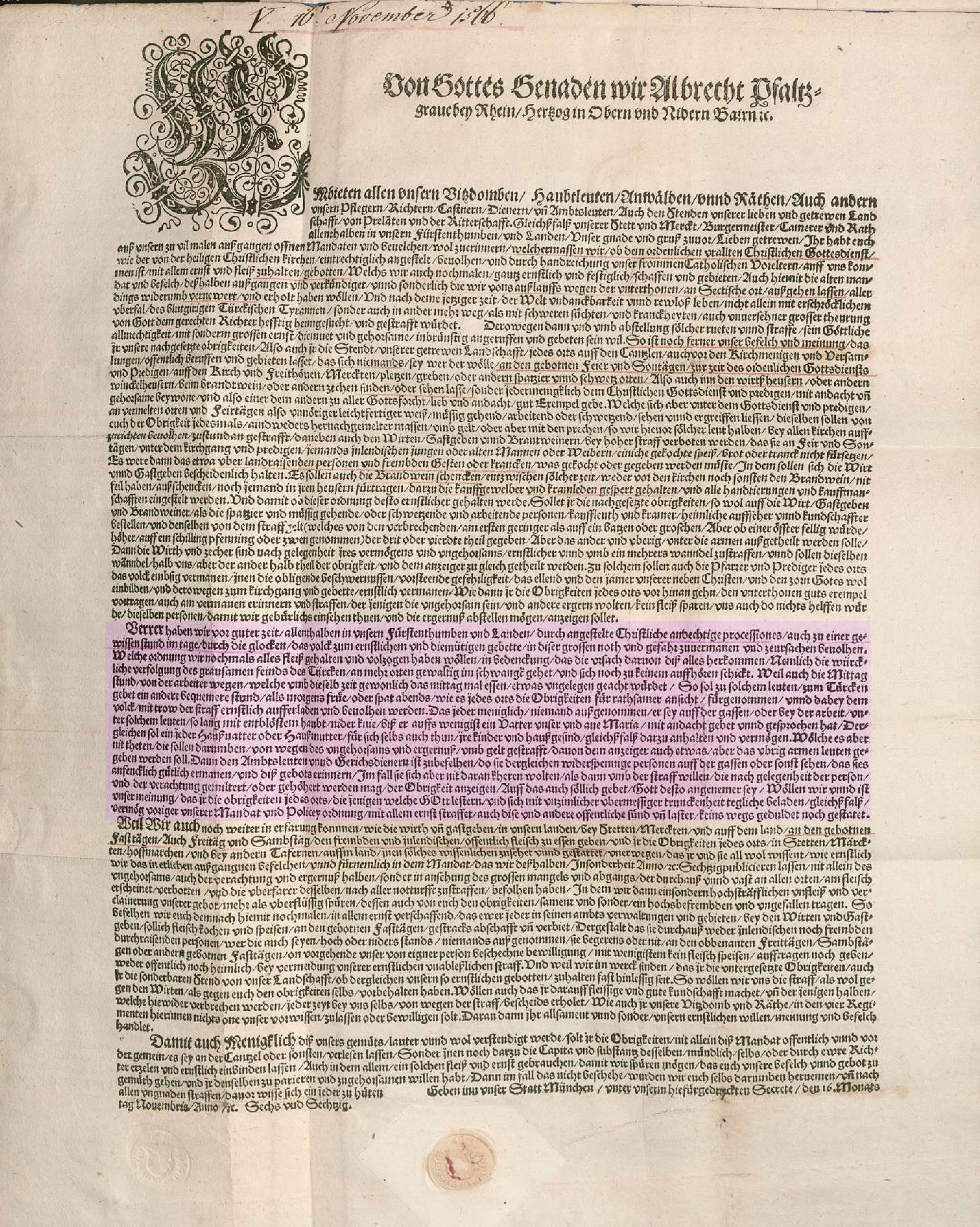 Mandat Herzog Albrechts V. von 1566: Erneute Aufforderung an die Amtleute usw., streng auf die Einhaltung der katholischen Feiertags- und Fastenordnung zu achten und Aufruf zu Gebet und Buße wegen der Türkengefahr (Bayerische Staatsbibliothek, Kloeckeliana 11).