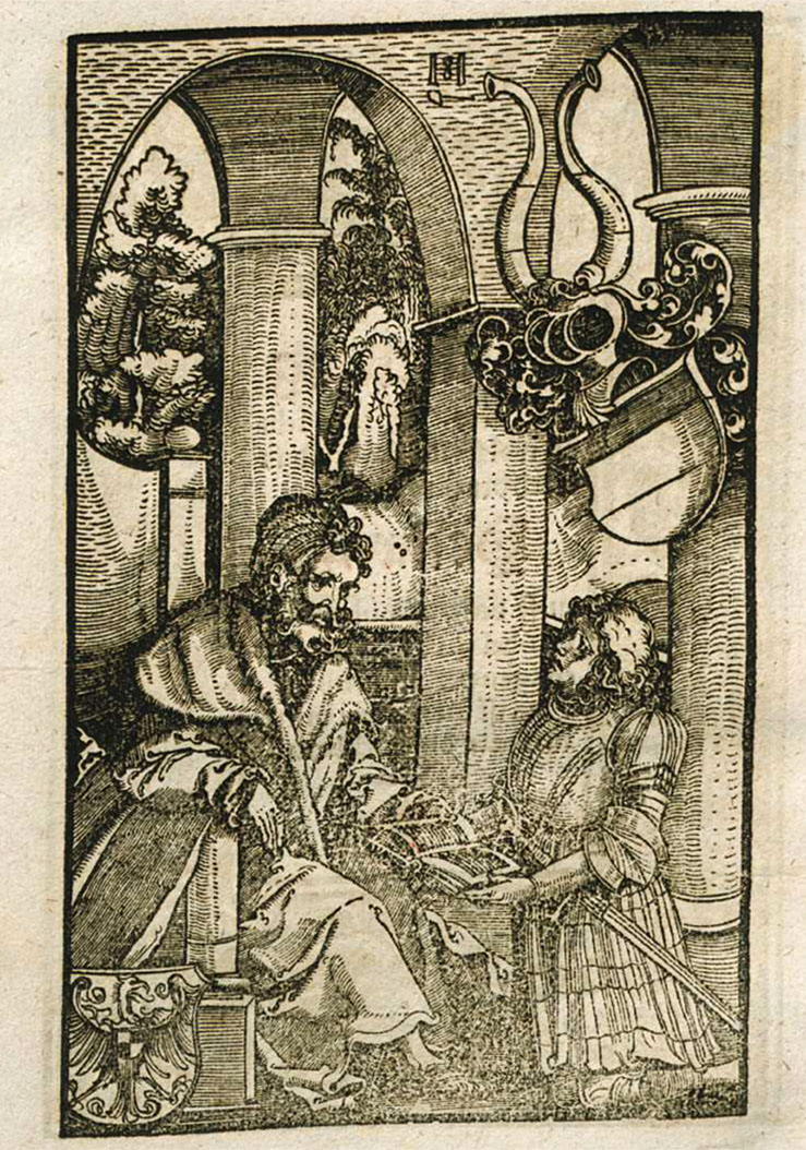 Markgraf Friedrich d. Ä. auf einem Holzschnitt aus dem Jahre 1517. (aus: Leonrodt, Hans von: Hymmelwagen auff dem, der wol lebt, fert in das Reich der Hymmel, Augsburg 1517, fol. 1v. ; Bayerische Staatsbibliothek Rar. 411)