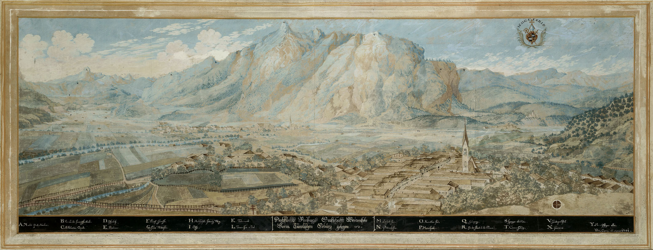 Valentin Gappnigg (1661/62-1736), "Hochfürsst: Freising Grafschafft Werdenfels", Blick auf das Loisachtal und das Kramergebirge mit dem Markt Partenkirchen (A; rechts), dem Dorf Garmisch (F; links), der Ruine der Burg Werdenfels (G; rechts hinten), von Osten aus betrachtet, Vedute aus dem Freisinger Fürstengang-Zyklus (1696-1702), 1701. (Diözesanmuseum Freising P 373, Foto: Walter Bayer)