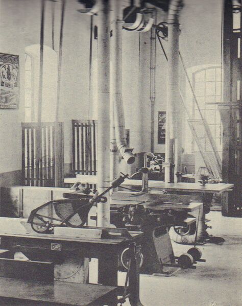 Maschinensaal im ersten Ausstellungsgebäude des Arbeiter-Museums auf dem Gelände am Kegelhof, 1905. Abb. aus: Museum für Arbeiter-Wohlfahrtseinrichtungen, Vierter Jahresbericht 1905, 48. (Bayerische Staatsbibliothek, Bavar. 1318 ahg) HLB