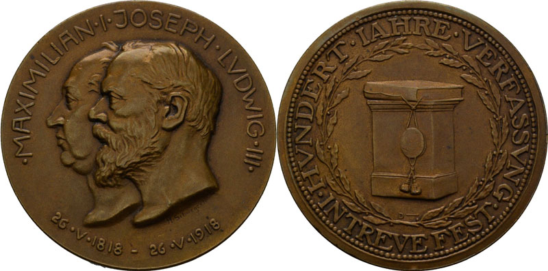 Bronzemedaille von Hans Schwegerle (1882-1950) und Maximilian Dasio (1865-1954) zum hundertjährigen Jubiläum der bayerischen Verfassung, München, 1918, Staatliche Münzsammlung München, M1657. (Lena Nitzer, Staatliche Münzsammlung München, 2016 lizenziert durch CC BY-NC-SA 4.0) HLB