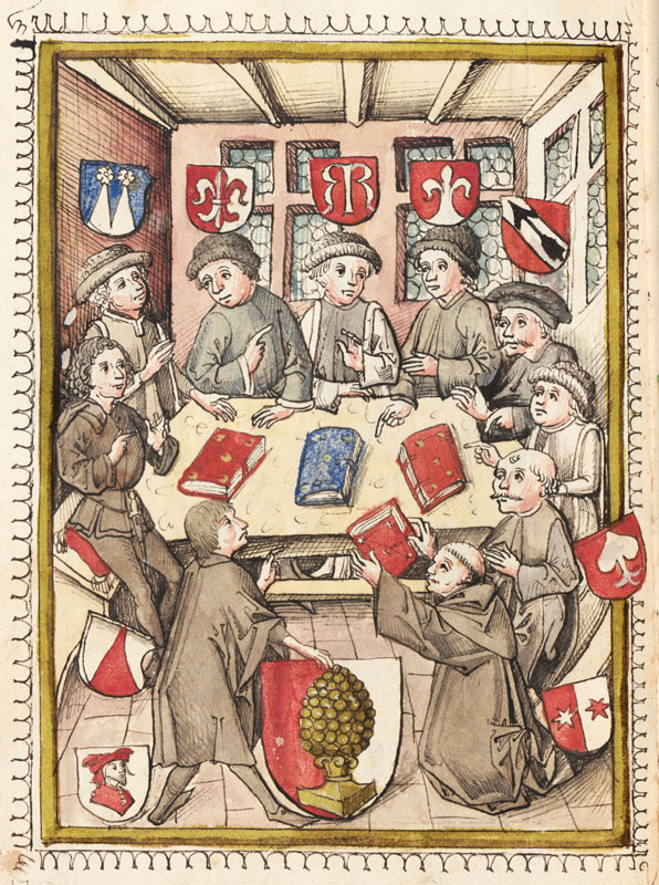 Eine der ältesten Darstellungen des Augsburger Rates findet sich in der Chronik des Sigismund Meisterlin (c. 1435-n. 1497). Auf dem Widmungsbild übergibt der Mönch dem Bürgermeister und dem Rat der Stadt Augsburg seine Chronik. Abb. aus: Sigismund Meisterlin, Augsburger Chronik, Augsburg 1479-1481, fol. 12v. (bavarikon) (Bayerische Staatsbibliothek, Cgm 213)