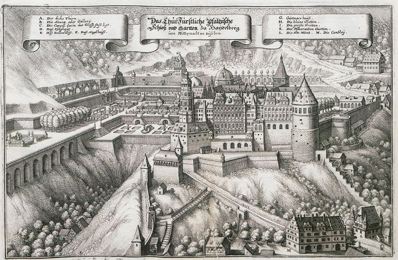 Der Stich von Matthias Merian von 1645 zeigt das Gebäude der 1462 erbauten Kanzlei unterhalb des Schlosses (M); Stich aus: Martin Zeiller u. Matthäus Merian [Hrsg.] Topographia Palatinatus Rheni et vicinarum Regionum [Frankfurt a.M.], 1645 ( UB Heidelberg lizensiert durch CC-BY-SA 3.0 DE).