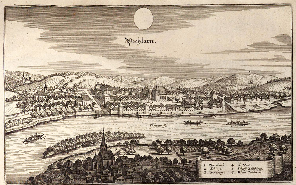 Ansicht der Stadt Pöchlarn. Stich von Matthaeus Merian (1593-1650), hier ein Nachdruck nach 1736. Abb. aus: Martin Zeiller u. Matthaeus Merian, Topographia Provinciarum Austriacaru[m], Frankfurt a. M. nach 1736, 19. (Bayerische Staatsbibliothek, 2 Bibl.Mont. 1046-1/2)