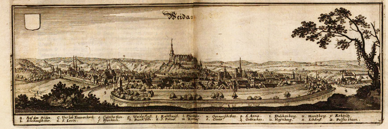 Stammsitz der Vögte war die Stadt Weida. Abb aus: Matthaeus Merian, Topographia Superioris Saxoniae Thüringiae …, Frankfurt 1650, n. 188. (Staatliche Bibliothek Regensburg 999/2Hist.pol.619(29/30)