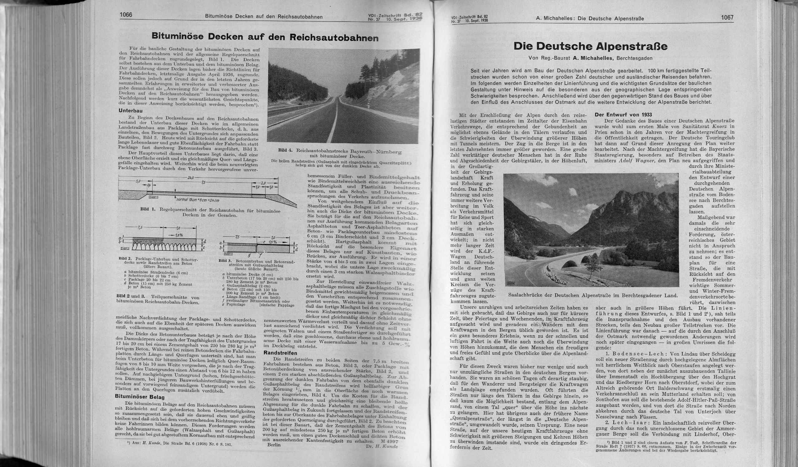 August Michahelles, Die Deutsche Alpenstraße, in: VDI. Zeitschrift des Vereins Deutscher Ingenieure 82, Nr. 37 vom 10. September 1938, 1067-1071. HLB