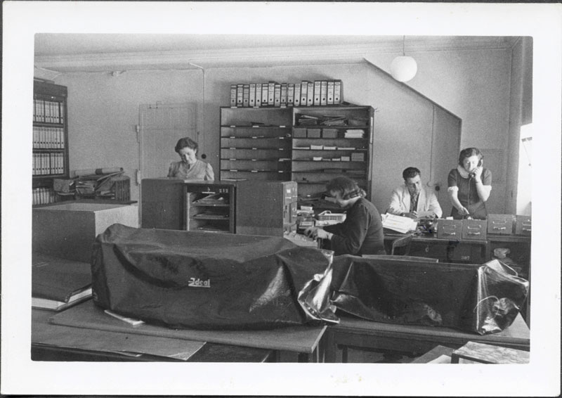 Braunes Haus, Mitarbeiter im Hauptarchiv der NSDAP. München 1930er. Am Telefon: Frau Charlotte Warthner. (Foto von Hans-Michael Tappen lizensiert durch [1] via [2]) HLB