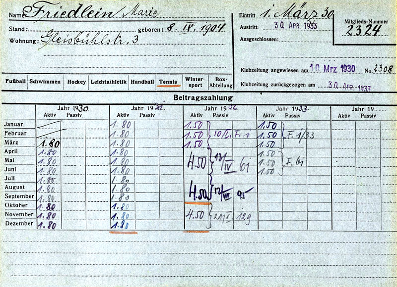 Mitgliedskarte Marie Friedlein: Mitgliedskarteikarte des 1. FC Nürnberg für Marie Friedlein (geb. 1904). Marie Friedlein wurde mit ihrem Mann Karl Siegbert Marcus Friedlein am 29. November 1941 von Nürnberg in das Lager Gut Jungfernhof (lettisch Jumpravmuiža) bei Riga (Lettland) deportiert und später ermordet. Marie Friedlein wurde am 30. April 1933 aufgrund ihres jüdischen Glaubens aus dem 1. FC Nürnberg ausgeschlossen. (Archiv 1. FC Nürnberg) HLB