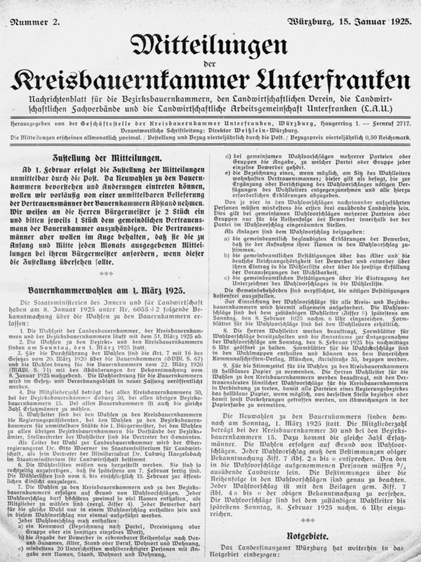 Titelblatt der "Mitteilungen der Kreisbauernkammer Unterfranken" vom 1. Januar 1925, Würzburg 1925.