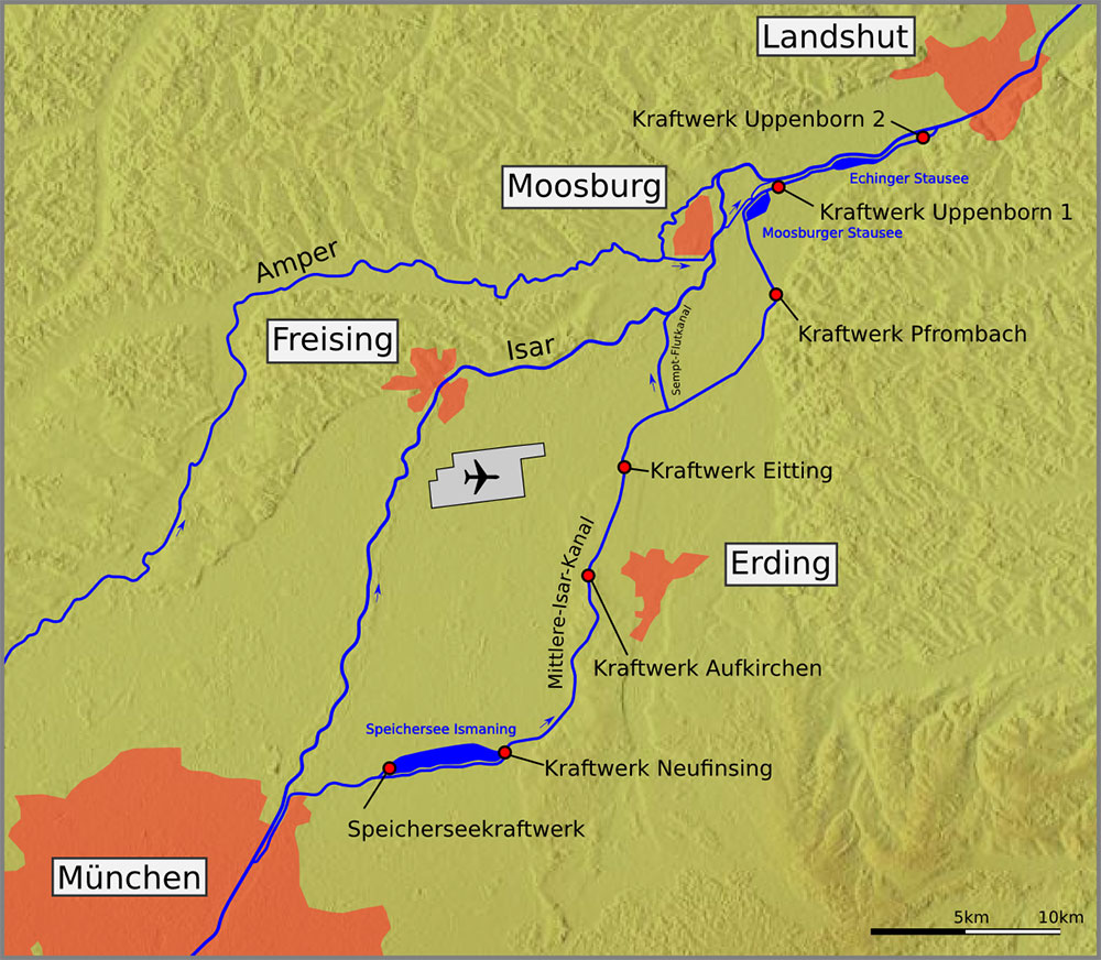 Karte des Mittleren-Isar-Kanals und seiner Kraftwerke. (Karte von Vuxi lizensiert durch CC BY-SA 3.0 via Wikimedia Commons)