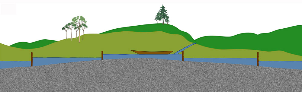 Modell eines Scheitelkanals mit Wasserzuleitung. Abb. aus: Ronald Bockius, Künstliche Schifffahrtswege. (Von Lukas Werther, Stefanie Berg, Peter Ettel, Sven Linzen, Johannes Schmidt und Christoph Zielhofer zur Verfügung gestellt)