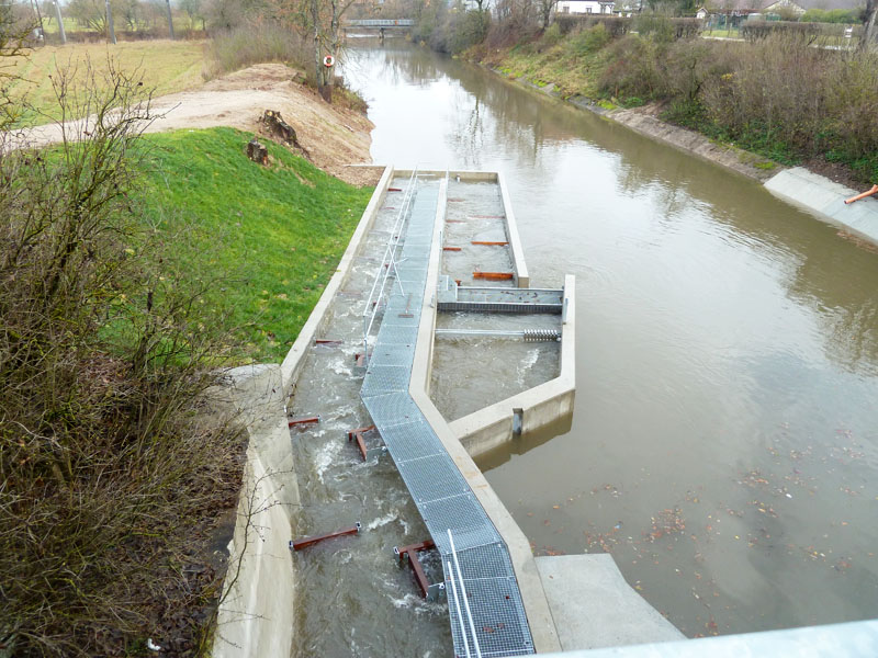 Beispiel einer nach modernen Gesichtspunkten bemessenen Fischaufstiegshilfe in Form eines sog. Vertical-Slot-Pass. Die Beckendimensionen, das Gefälle und die Strömungsverhältnisse müssen der Größe und Leistungsfähigkeit der einschlägigen Fischarten angepasst sein. (Foto: privat)