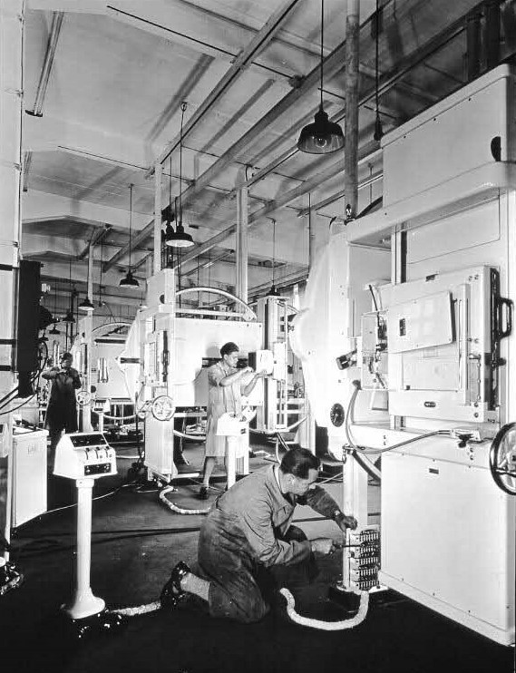 Montage von medizintechnischem Gerät bei den Siemens-Reiniger-Werken in Erlangen um 1955. Zusammen mit Siemens & Halske und den Siemens-Schuckertwerken gingen die Reiniger-Werke 1966 in der Siemens AG auf. (Siemens Historical Institute) HLB