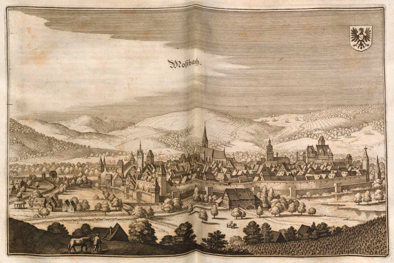 Ansicht von Mosbach in der "Topographia Palatinatus Rheni et Vicinarum Regionum" von Matthäus Merian um 1672. (Bayerische Staatsbibliothek 2 Bibl.Mont. 1046-5/7)