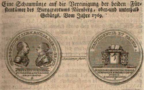 Münze zum Gedenken an die Vereinigung der beiden Markgraftümer Bayreuth und Ansbach unter Markgraf Alexander 1769. Abb aus: Johann Jakob Spieß, Der brandenburgischen historischen Münzbelustigungen […], Bd. 3, Ansbach 1770, 105. (Bayerische Staatsbibliothek, 4 Num.rec. 124 h-3)