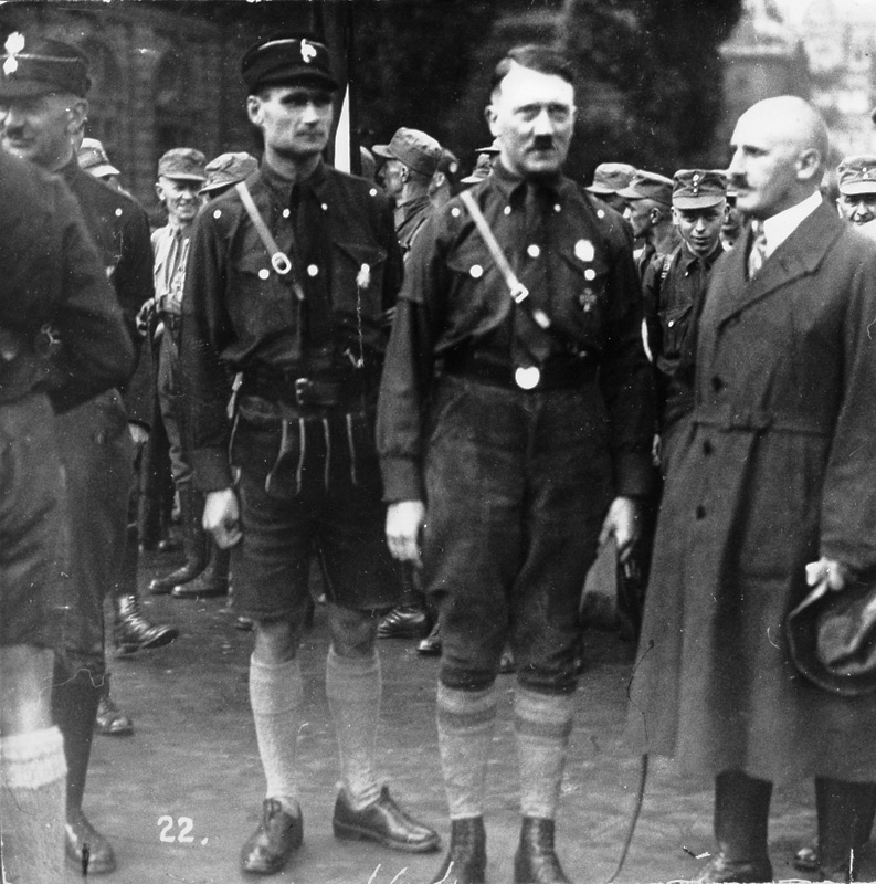 V.l.n.r.: Rudolf Heß (Minister, Obergruppenführer, 1894-1987), Adolf Hitler (1889-1945), Julius Streicher (Gauleiter, Obergruppenführer, 1885-1946), Reichsparteitag NSDAP 1927 in Nürnberg. Fotografie von Heinrich Hoffmann. (Bayerische Staatsbibliothek, Bildarchiv hoff-6806) HLB
