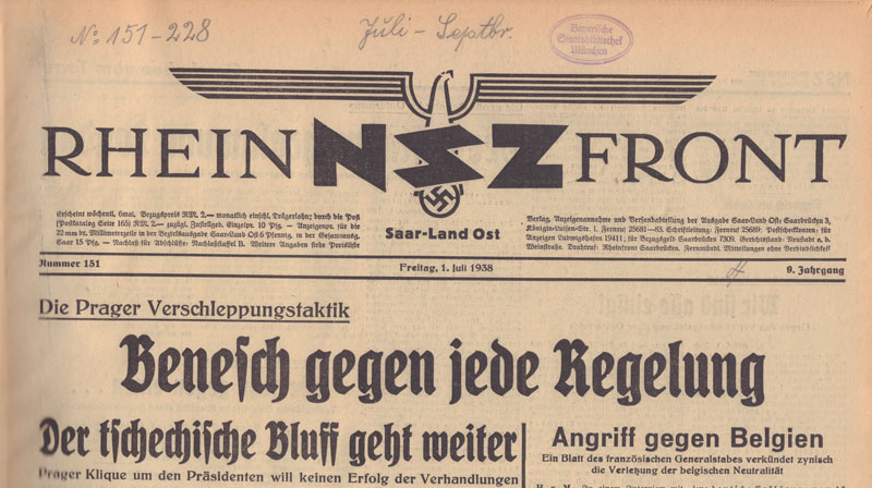 Kopf der Titelseite der Zeitung NSZ Rheinfront vom 1.Juli 1938. (Bayerische Staatsbibliothek 2 Eph.pol. 84 t-1938, 3) HLB