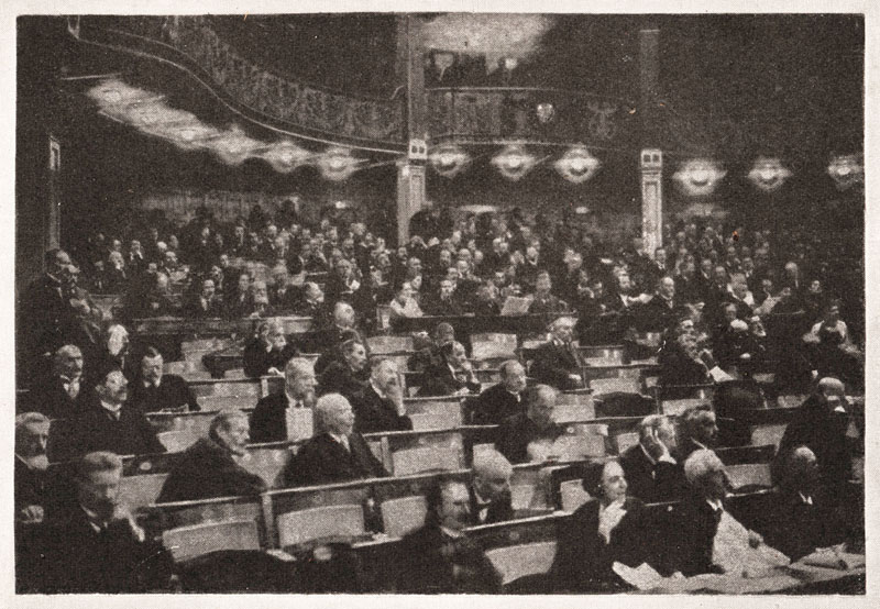 Sitzung der Nationalversammlung im Weimarer Hoftheater. Abb. aus: The Times (Hg.): History of the war, vol. XXI., London 1920, 307. (Bayerische Staatsbibliothek, 4 H. un. app. 3 x-21)