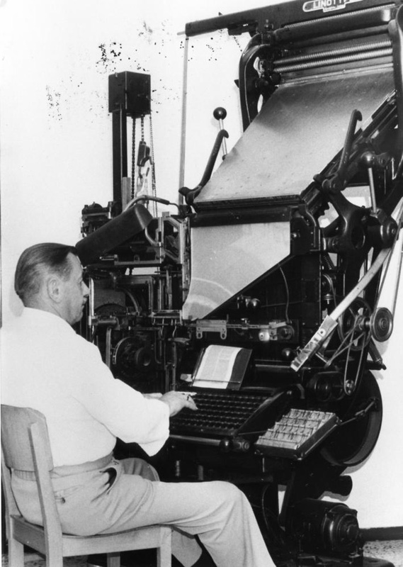 Linotype Bleisetzmaschine in der Druckerei der "Neuen Presse". Ende des 19. Jahrhunderts gelang es, das mühsame manuelle Setzen der Bleilettern zu mechanisieren. Die hier gezeigte Bleisetzmaschine vom Typ Linotype geht auf den aus Hachtel bei Bad Mergentheim (Baden-Württemberg) in die USA emigrierten Ottmar Mergentheimer (1854-1899) zurück. (Neue Presse Coburg) HLB