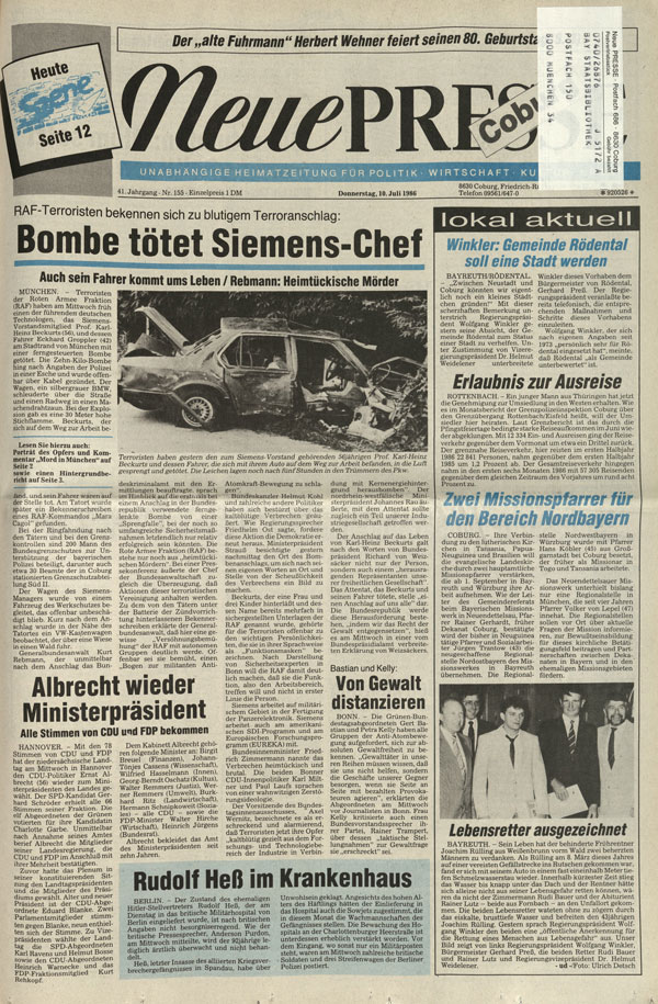 Titelseite der Neuen Presse vom 10.7.1986. (Neue Presse Coburg) HLB