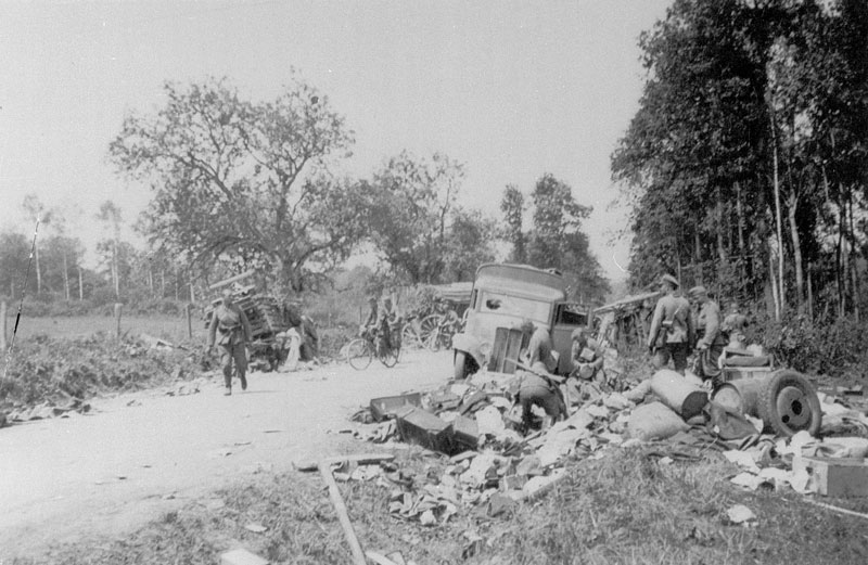 Durch Tieffliegerangriff zerstörte Wehrmachtsfahrzeuge auf einer Straße in der Nähe von Neumarkt in der Oberpfalz, April 1945 (Stadtarchiv Neumarkt in der Oberfalz)