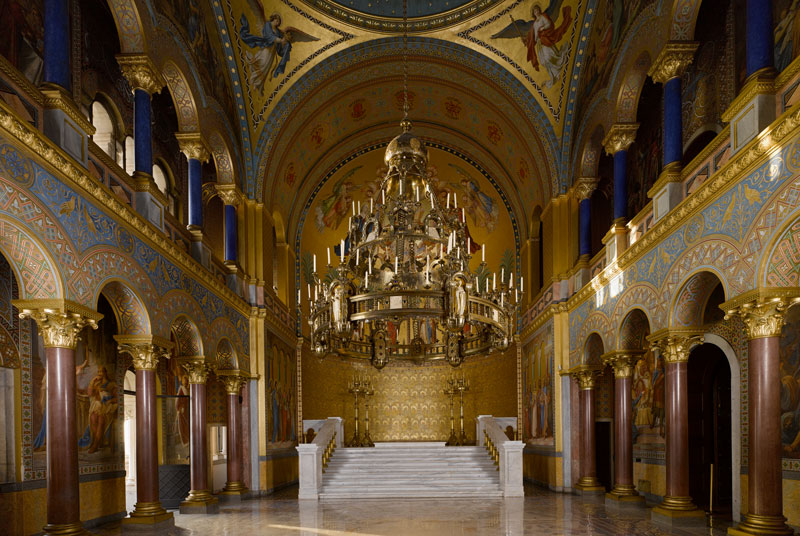 Thronssal von Schloss Neuschwanstein, Palas. Blick nach Norden Richtung Apsis. Lüster von Eduard Wollenweber (1822-1889). (© Bayerische Schlösserverwaltung, Rainer Herrmann, München) HLB