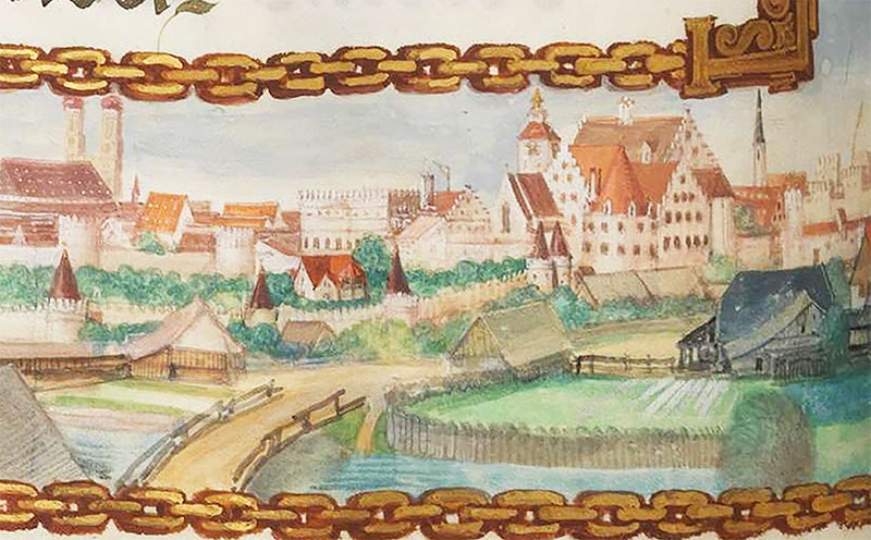 Realistische Darstellung der Münchner Neuveste in einer Miniatur um 1559 von Hans Muelich, Abb. aus: Orlando di Lasso/Hans Muelich: Motetten, München 1559, S. 257. (Bayerische Staatsbibliothek Mus.ms. B(1)