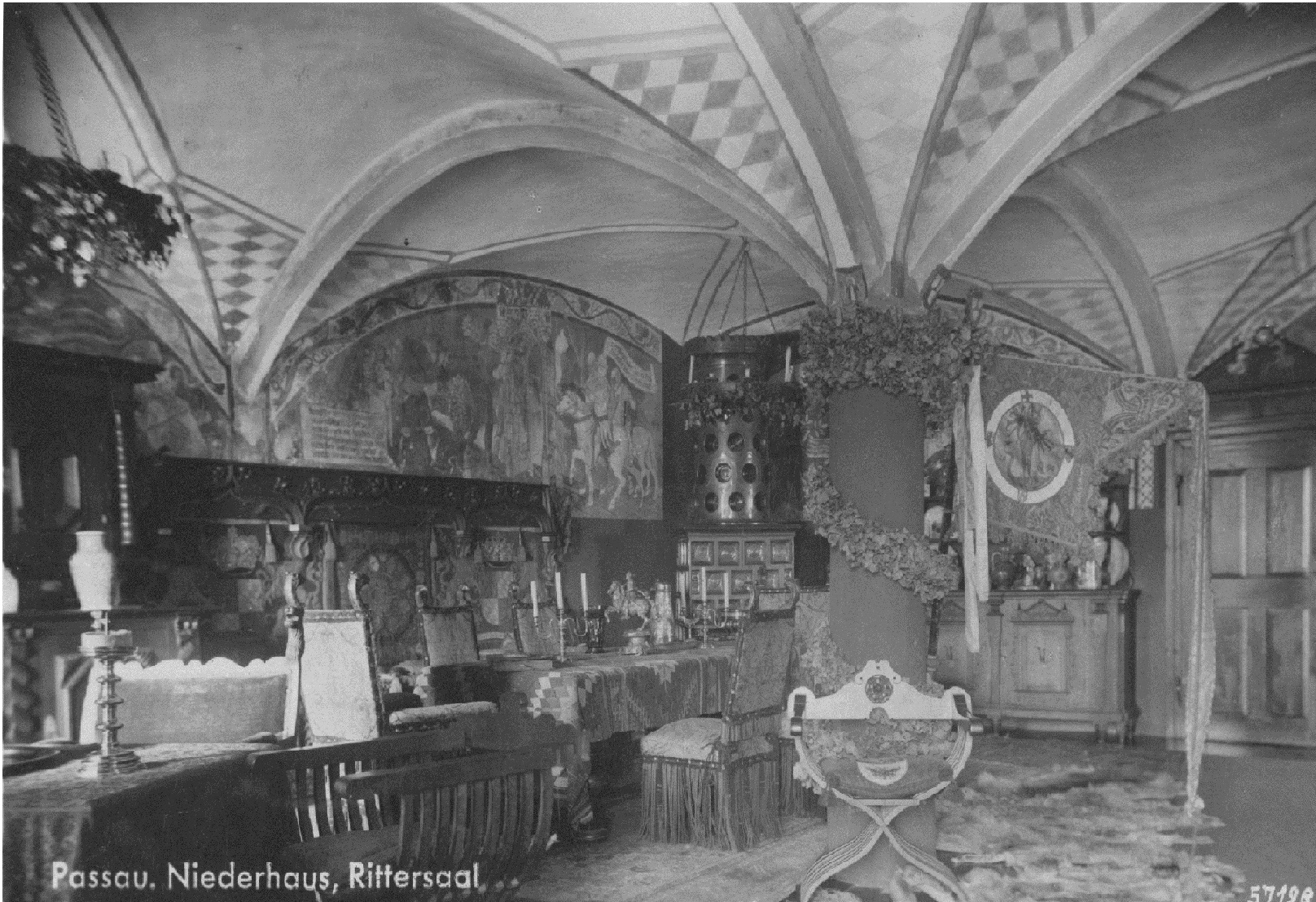 Aufnahme des so genannten Rittersaals im Niederhauses von 1929; Ferdinand von Wagner hatte die Räumlichkeiten des Niederhauses Ende des 19. Jahrhunderts im Stil des Historismus ausgestattet. Wesentliche Teile der Ausstattung Wagners sind heute noch erhalten. (Bayerische Staatsbibliothek, Bildarchiv, port-015361)