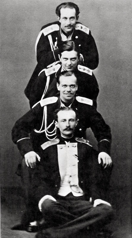 Gruppenporträt, um 1863: (von oben nach unter) Herzog Nikolaus von Leuchtenberg (1843-1891, Enkel Zar Nikolaus I. (reg. 1825-1855)), Großfürst Wladimir Alexandrowitsch (1847-1909, Sohn von Zar Alexander II. (reg. 1855-1881)), Zarewitsch Alexander Alexandrowitsch (1845-1894; reg. als Alexander III 1881-1894; Sohn von Alexander II.), Prinz Albert von Sachsen-Altenburg (1843-1902). (Gemeinfrei via Wikimedia Commons HLB