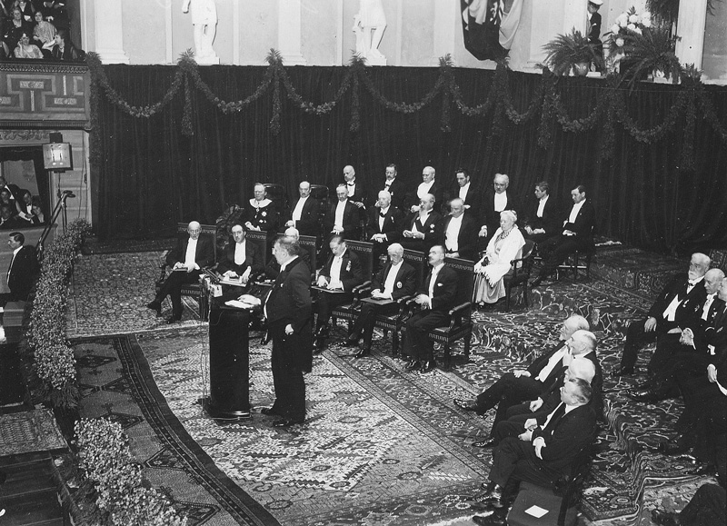 Feier zur Verleihung der Nobelpreise 1929 in Stockholm. In der ersten Reihe am Mittelgang ist Thomas Mann (1875-1955) zu erkennen, der in diesem Jahr den Literaturnobelpreis für sein Frühwerk "Buddenbrooks" erhielt. (Foto: Axel Malmström, Gemeinfrei via Wikimedia Commons)