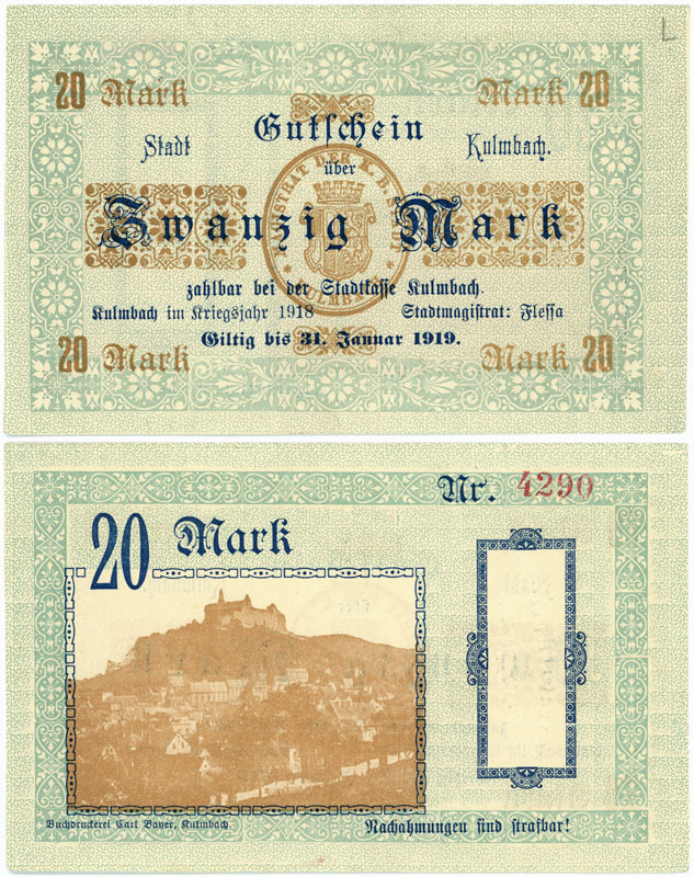 Gutschein über 20 Mark, ausgegeben von Stadt Kulmbach im Jahr 1918. (bavarikon) (HVB Stiftung Geldscheinsammlung - Inventarnummer: DE-BY-95326-V422c)