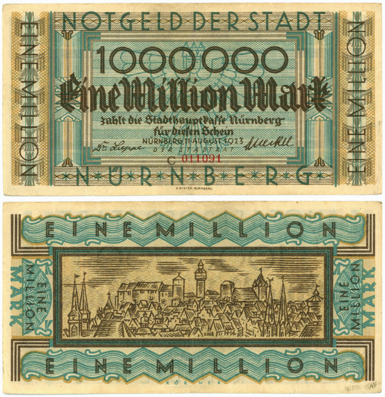 Notgeld über 1 Million Mark, ausgegeben von der Stadt Nürnberg im Jahr 1923. (bavarikon) (HVB Stiftung Geldscheinsammlung - Inventarnummer: DE-BY-90402-V1029f)